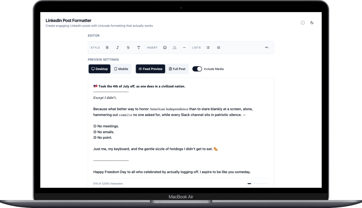 LinkedIn’s post editor is a nightmare for anyone trying to share technical ideas. No bold, no italics, no proper lists—just raw plaintext that often breaks on mobile. As developers who’d rather be debating on Reddit than wrestling with LinkedIn’s limitations, we feel the pain. Clear communication matters, whether it’s a system design breakdown or a debugging tip. So, on July 4th, while others were grilling, the Strike Labs team built a Unicode-based formatting tool to make LinkedIn posts actually readable. Using React, Tailwind, and Supabase, we tackled this for the greater good of the dev community. Here’s the problem, our solution, and the code-heavy details of how we pulled it off.